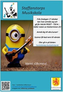Från 17 oktober och fram till resten av terminen gäller halva priset om man vill gå på någon av våra musikkurser. Vi har några lediga platser inom: gitarr, piano, trombon, trumpet, sång och saxofon.